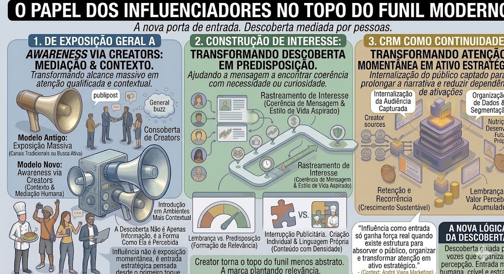 Os influenciadores se tornaram parte central do topo do funil moderno porque a descoberta já não acontece apenas por meio de canais impessoais. Hoje, ela é mediada por vozes que organizam percepção, reduzem resistência e ajudam o público a prestar atenção no que talvez passasse despercebido em outro formato.